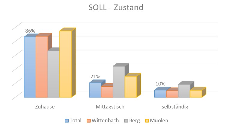 Die Umfrage zeigt, dass 94% aller Befragten das Mittagessen zuhause im Kreise der Familie einnehmen. Ein kleiner Teil der Schülerinnen und Schüler (14%) isst am Mittag jeweils ohne elterliche Betreuung respektive nimmt bereits an einem Mittagstisch (5%) teil. Für 21% der Schulkinder gibt es auch noch andere Lösungen, wie zum Beispiel Mittagessen bei Freunden oder den Grosseltern. Da bei der Beantwortung der Frage zum IST-Zustand mehrere Antworten zulässig waren, sind auch Kombinationen möglich: beispielsweise dreimal pro Woche Mittagessen zuhause mit den Eltern, einmal das Mittagessen bei Freunden und einmal pro Woche der Besuch des Mittagstisches.